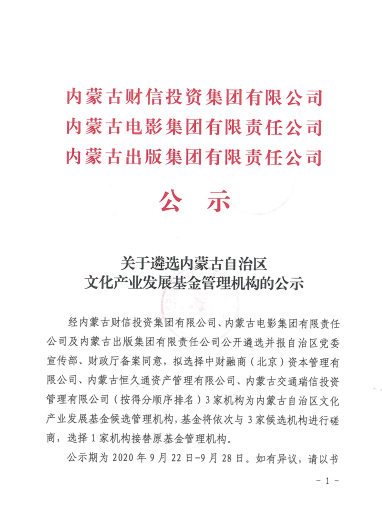 關于遴選內蒙古文化產業發展基金管理機構(普通合伙人/執行事務合伙人)的公告
