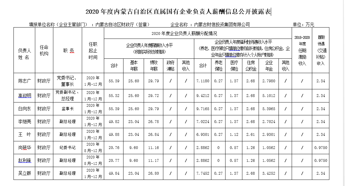 2020年度內蒙古自治區直屬國有企業負責人薪酬信息公開披露表